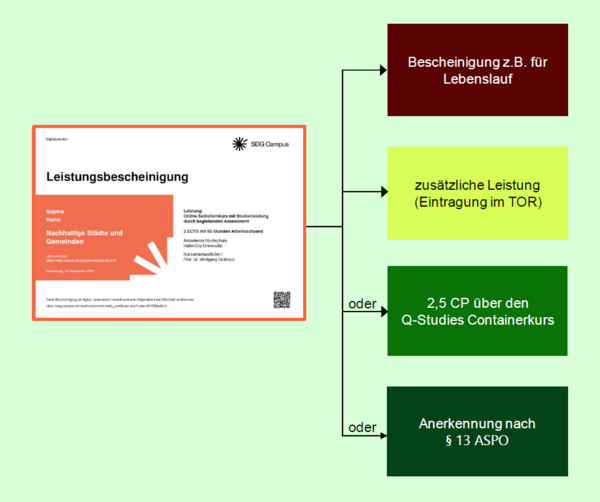 Du hast folgende Möglichkeiten, die Leistungsbescheinigung zu nutzen, die du für einen absolvierten Kurs auf dem SDG Campus erhältst: