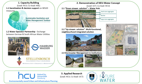 NEU-Water addresses the urgent need for resilient urban water systems in the face of climate change by developing innovative nature-based solutions and processes for sustainable stormwater and greywater management and reuse in underserved urban areas of South Africa and Tanzania. The project brings together water utilities, researchers and urban planners to evaluate and develop nature-based decentralized, inclusive approaches to water-sensitive urban development. By combining technical innovation with community engagement and awareness-raising through a universal languages approach, NEU-Water aims to create scalable, context-sensitive solutions that strengthen water security and promote sustainable urban development. The project is divided into 4 Work Packages: