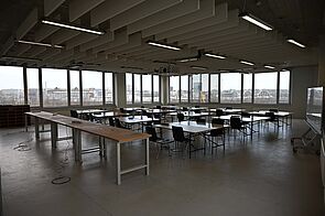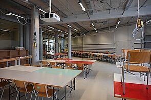 Lesen und Lernen ist auch in der Mensa mit mehreren Hundert Plätzen möglich. Einzige Einschränkung: Wenn die Mensa geöffnet ist oder dort eine Veranstaltung stattfindet, können die Öffnungszeiten montags bis freitags von 14:30 Uhr bis 23 Uhr abweichen oder ausfallen. Bitte beachten Sie, dass die Arbeitsplätze in der Mensa ohne Stromanschluss sind. Arbeitsplätze mit einem Stromanschluss stehen Ihnen in der Cafeteria oder im 1. OG im Bereich der studentischen Ateliers zur Verfügung.